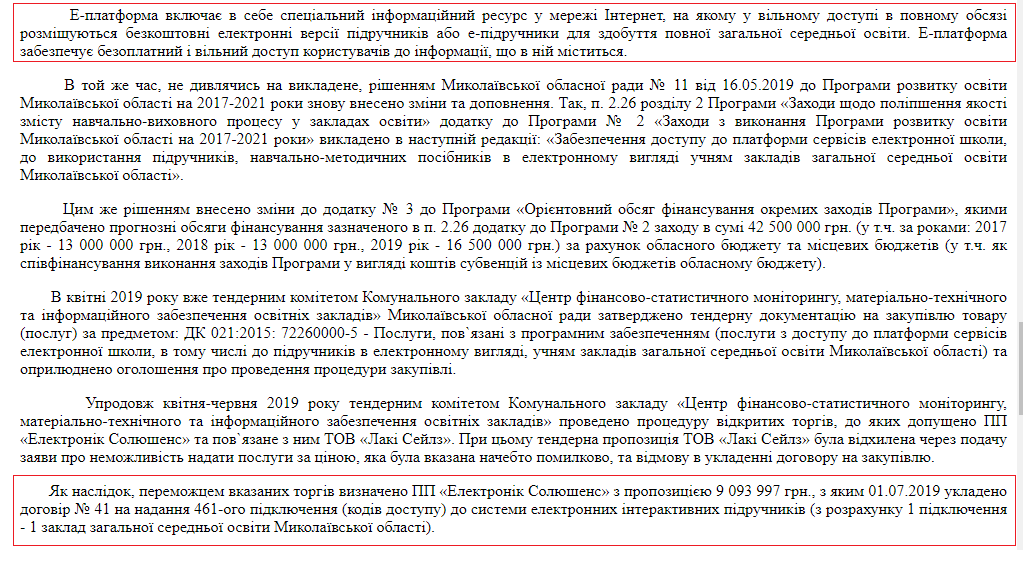 Более того, в 2019 году Николаевский облсовет снова предусмотрел финансирование программы доступа к электронным учебникам для учеников области. В апреле снова был объявлен тендер на закупку этих услуг, который снова выиграло ООО "Электроник Солюшенс".