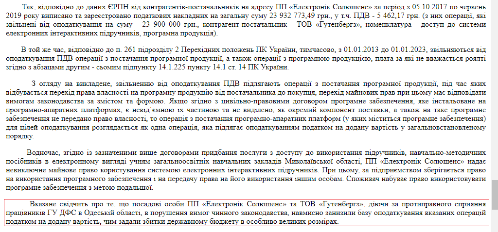 Кроме того, следствие установило, что за период с 05.10.2017 по июнь 2019 года были выписаны налоговые накладные по НДС на общую сумму 23,9 млн грн. Контрагентом - поставщиком выступило тоже ООО "Гутенбергз". НДС при этом указывался по ставке 0 % как за программный продукт. Хотя Налоговый кодекс, по мнению следствия, в данном случае не дает права на налоговую льготу.