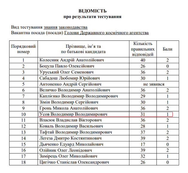 По всем трем предметам Владимир Усов оказался в числе либо середнячков, либо аутсайдеров. Согласно данным на сайте Нацагенства госслужбы, которое проводило конкурс, по знанию законодательства Усов оказался ровно посередине, с результатом 31 бал из 40. Он отстал от 9 своих конкурентов из общего количества 18 человек:
