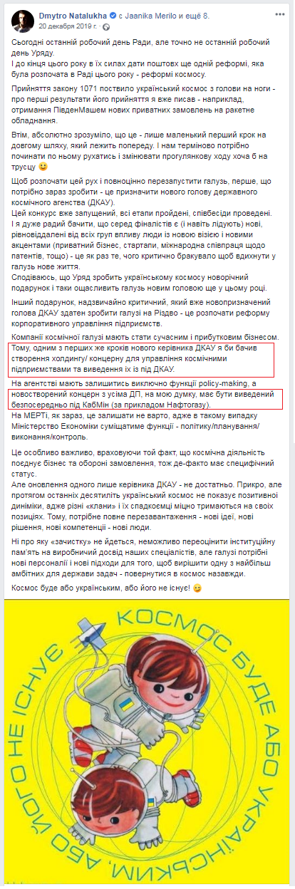 Этот план нардеп сопроводил иллюстрацией из детской книжки с надписью "Космос будет или украинский, или его не существует":