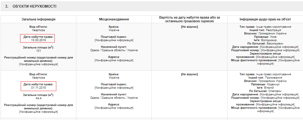 К примеру, новый глава Госкосмоса в 2018 году не задекларировал право пользования двумя квартирами в Одессе. В одной (квартира отца) он был прописан, а во второй фактически проживал в течение части 2018 года. Об этом свидетельствуют даты получения права на пользование квартирами – 13 марта и 1 ноября 2018 года: