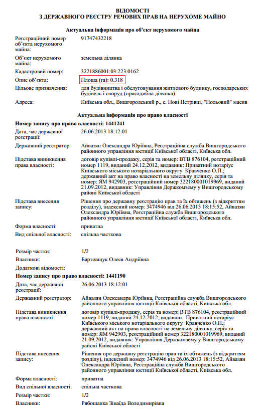 Начиная с 2015 года, Руслан Рябошапка постоянно декларирует, что его жене принадлежит половина участка с домом в селе Новые Петровцы (Вышгородский район под Киевом). Например, в последней из поданных деклараций он указал, что Олеся Бартовщук владеет 50% квартиры на 150 "квадратов" и половиной участка площадью 318 квадратных метров в Новых Петровцах.