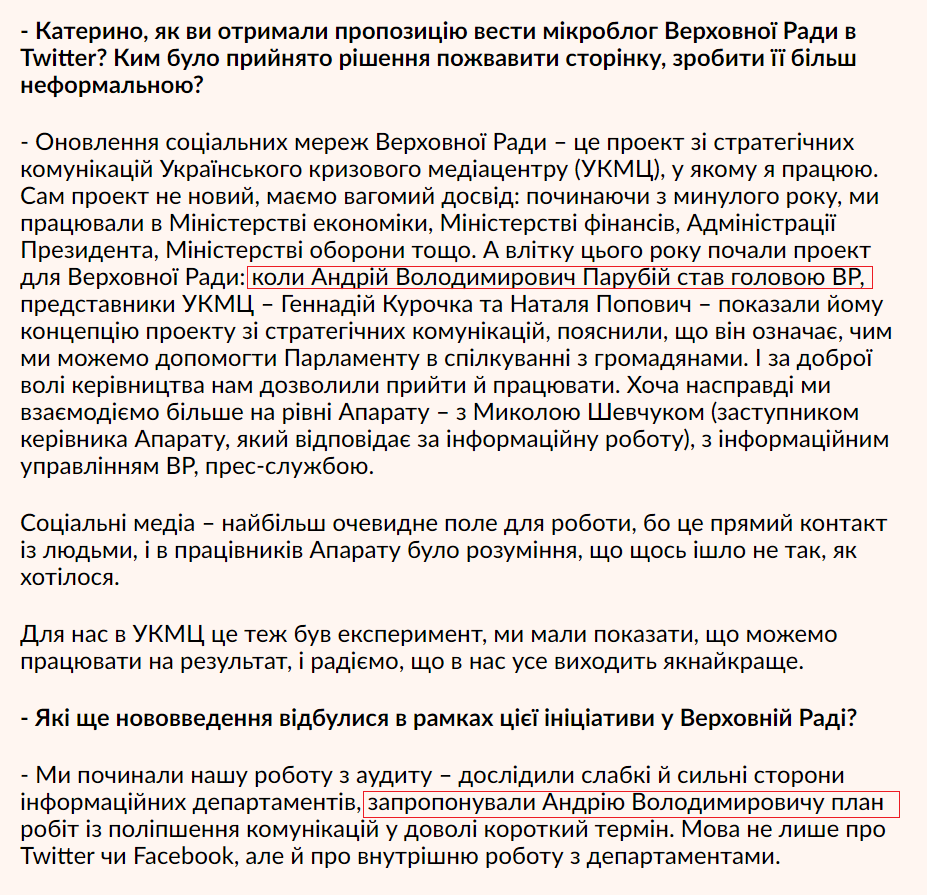 О руководстве ее деятельностью со стороны Парубия Екатерина Крук сама рассказала в одном из интервью. В нем она уважительно называла своего босса "Андрій Володимирович":