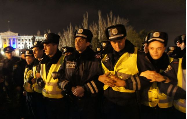 Такие действия не понравились представителю инспекции по благоустройству Николаева, который потребовал убрать палатки. Поскольку протестующие не послушались, то инспектор обратился к начальнику отдела общественной безопасности городской милиции, который в это время тоже был на площади. Сотрудники милиции стали в цепь и начали оттеснять участников акции, чтобы коммунальщики могли разобрать палатки.