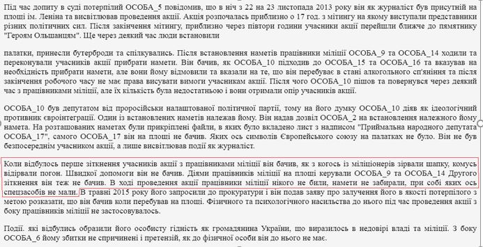 Тем не менее пострадавший сообщил, что события оскорбили его личное достоинство как гражданина Украины, что выразилось в недоверии власти и милиции.