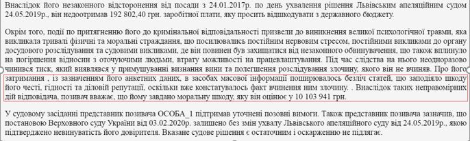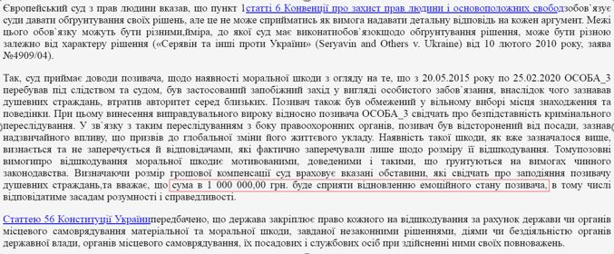 "Определяя размер денежной компенсации, суд учитывает указанные обстоятельства, свидетельствующие о причинении истцу душевных страданий, и считает, что сумма в 1 млн. грн. будет способствовать восстановлению эмоционального состояния истца, в том числе отвечать принципам разумности и справедливости", – говорится в решении суда от 22 сентября этого года: