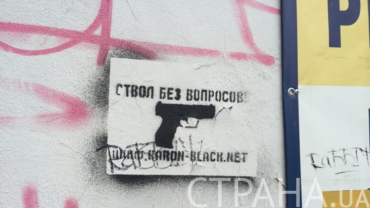 В Киеве стали открыто продавать огнестрельное оружие. На стенах домов в Дарницком районе столицы появились соответствующие объявления-картинки граффити с надписью "Ствол без вопросов", где также указан адрес интернет-сайта продавца оружия (baron-black.net).