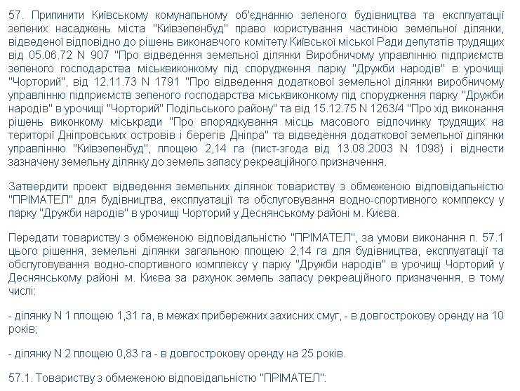 Еще в 2003 году решением Киевского горсовета фирме "Примател" были выделены в аренду четыре участка, которые расположены рядом в урочище Чорторый в Киеве, в районе парка Дружбы народов. Эти участки горсовет забрал у "Киевзеленстроя" и выделил "Примателу" для строительства водно-спортивного комплекса: