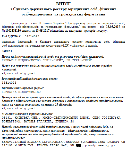 Кроме двух садовых товариществ, Сергей Скуратовский "забыл" задекларировать несколько фирм посерьезней. Супруга нардепа Людмила Скуратовская была конечным бенефициаром фирмы "Грин Грей" до 19 мая 2017 года. Сведения об этом имеются в выписке из реестра юридических лиц, который попал в распоряжение "Страны". Однако, как сообщала "Страна", в декларации нардепа за 2016 год эта компания не была указана:
