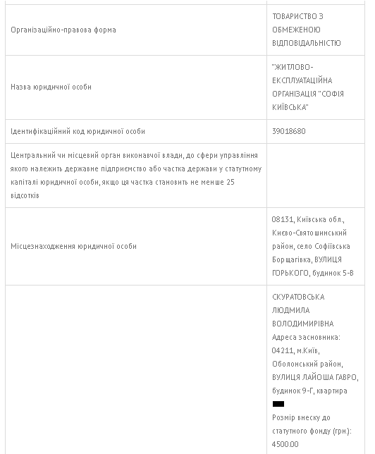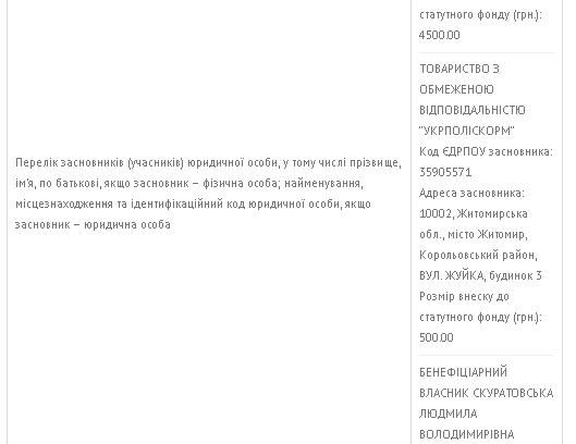 Но самый крупная "забытая" фирма в декларации нардепа за 2015 год - уже упомянутая фирма "Укрполискорм", которая занималась строительством ЖК "София Киевская". Хотя в 2014-2016 годах ее единственным владельцем также была Людмила Скуратовская. Об этом говорится в выписке из реестра юридических лиц по состоянию на конец 2015 года, которая также есть в распоряжении "Страны":