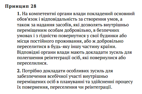 Европейский суд по правам человека также указал, что основной долг и ответственность органов власти заключается в создании условий и предоставлении соответствующих средств, которые позволили бы перемещенным лицам возможность добровольно, безопасно и достойно вернуться в свои дома или места обычного проживания, или по собственному желанию переселиться в другие районы страны. Это соответствует принципам 18 и 28 "Руководящих принципов ООН по проблеме внутренне перемещенных лиц" от 11 февраля 1998 года: