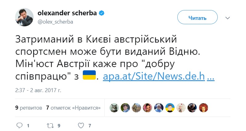 "Задержанный в Киеве австрийский спортсмен может быть выдан Вене. Минюст Австрии говорит о "хорошем сотрудничестве" с Украиной", - написал тогда Щерба.