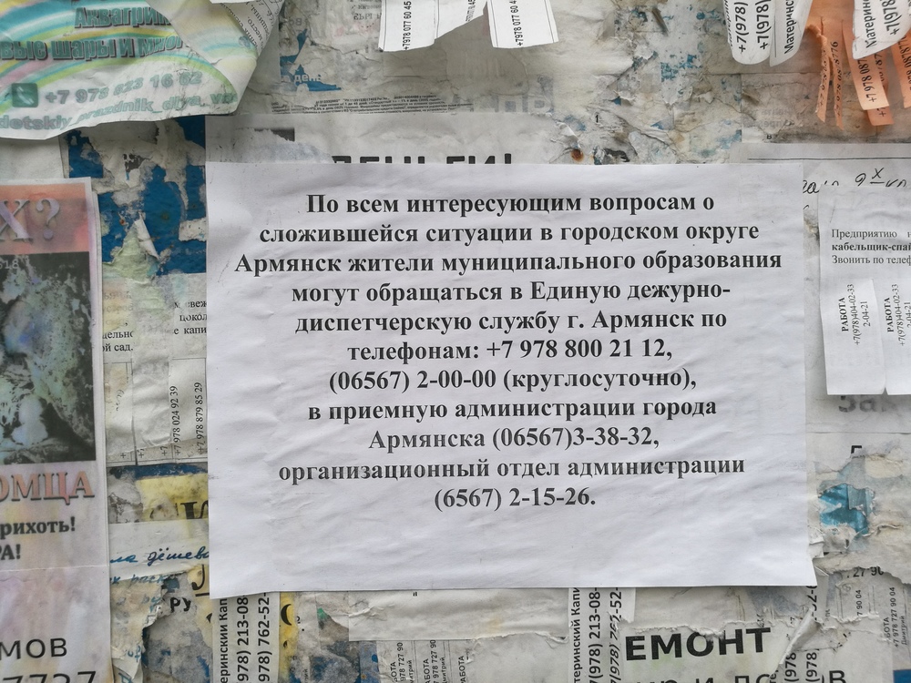 Остановка "Центр". До администрации города рукой подать. На доске объявлений кроме приглашений на работу по уборке яблок, ремонте компьютеров и продаже квартир, обращение к жителям. На обычном листе формата А4 указаны телефоны горячих линий, единой дежурно-диспетчерской службы Армянска.