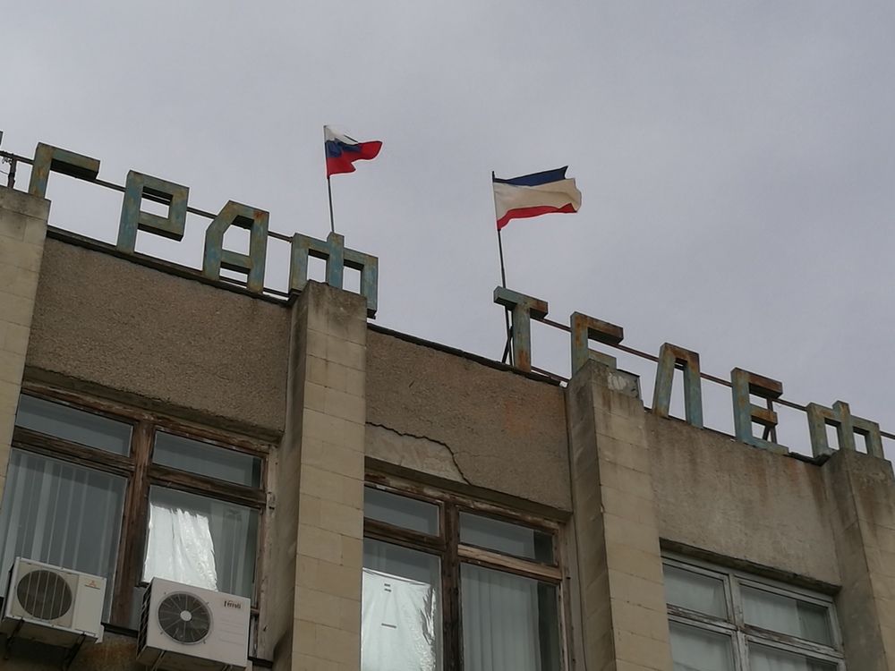 Потрепанный ветрами флаг Крыма бодро развевается на крыше админздания.
