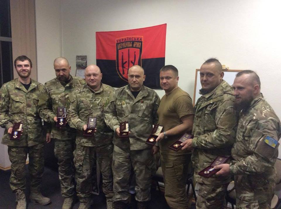 Крайний слева - улыбчивый подозреваемый с позывным Шуруп сразу после получения государственных наград бойцами "Украинской добровольческой армии" (УДА).
