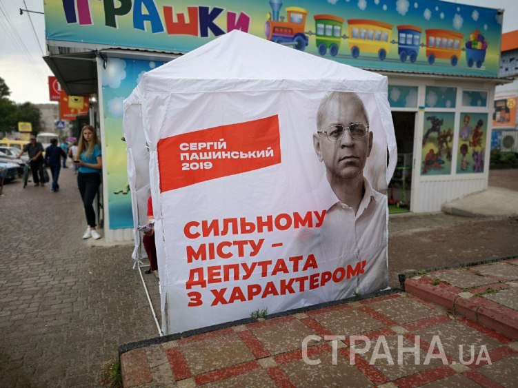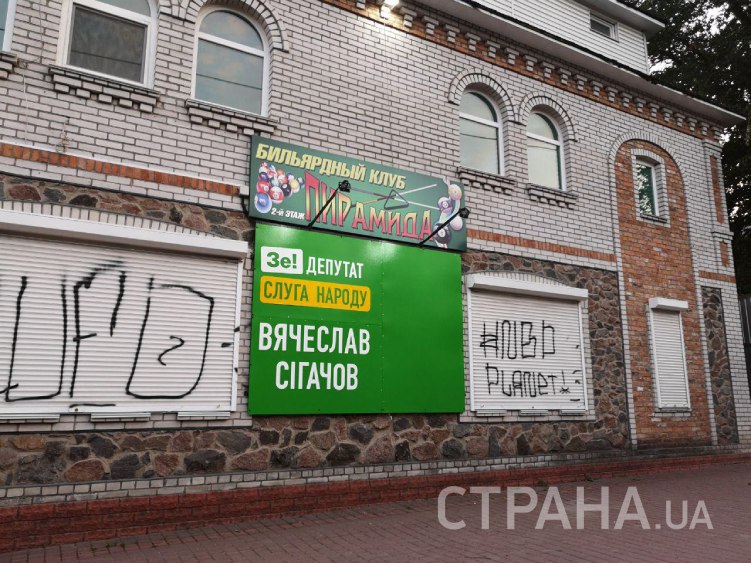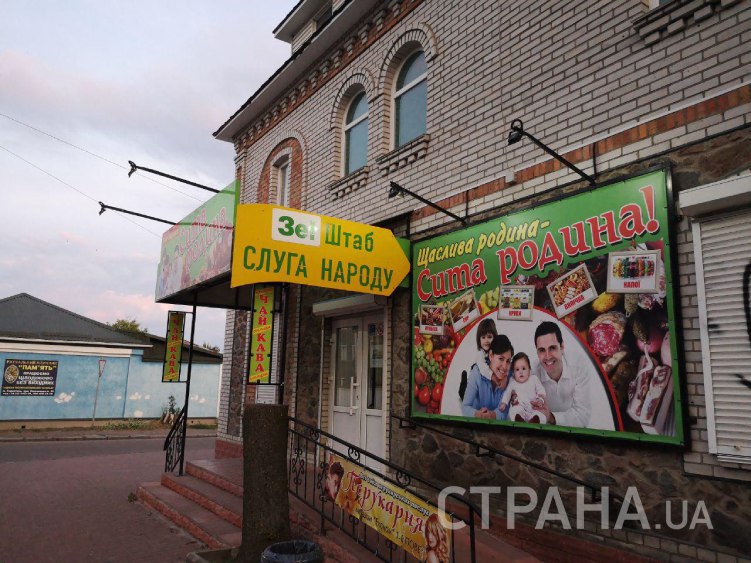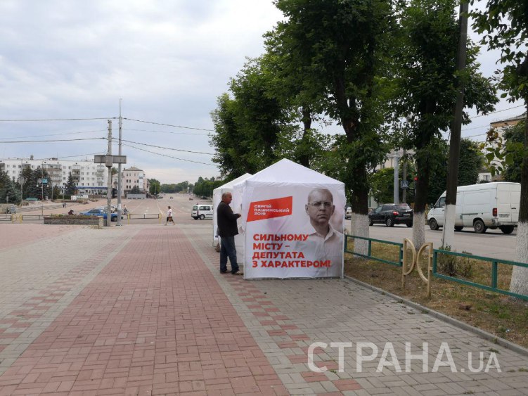 На каждом шагу – агит-палатки и борды Пашинского. Чуть меньше – у Арешонкова. У Сигачева от "Слуги народа" – ни одного. Кроме, разве что, единственной вывески возле "ЗЕштаба", расположенного в здании продуктового магазина, бильярдной и парикмахерской.