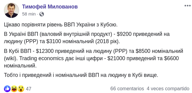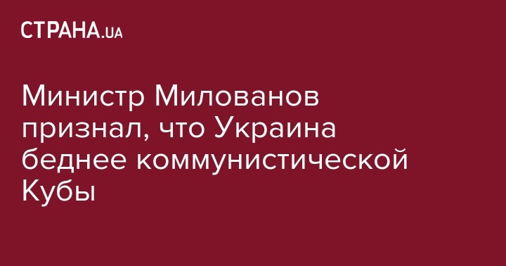Министр развития экономики, торговли и сельского хозяйства Украины Тимофей Милованов на своей странице в Facebook сравнил ВВП (внутренний валовой продукт) Украины и Кубы, которая является одним из самых небогатых государств в мире и пришел к выводу, что Куба, согласно экономических показателей, живет лучше Украины.