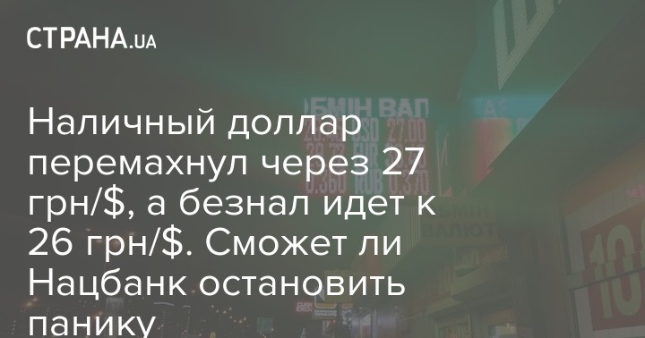 Сильно взлетели наличные курсы, причем не только в финансовых компаниях, но и в банках. Средний курс "американца" на продаже подскочил на 60-80 копеек, и находится в очень широком диапазоне — 26,20-26,60 грн/$. А максимальный перевалил за психологический уровень и достигает 27,0 грн/$ у банков (Банк Конкорд, Банк Сич) и 27,10 грн/$ у финансовых компаний.
