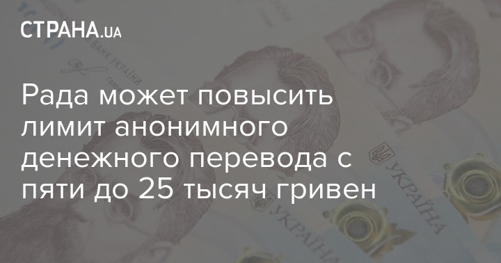 В парламент поступил законопроект об увеличении максимальной суммы денежного перевода, который можно сделать анонимно, до 25 000 гривен. Сейчас лимит составляет пять тысяч.