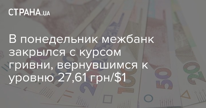 В понедельник, 10 августа, на межбанковском валютном рынке курс гривни к закрытию торгов вернулся к уровню предыдущего рабочего дня - 27,61 грн/$1. Котировки нацвалюты, как и 7 августа, составили 27,60-27,62 грн/$1.