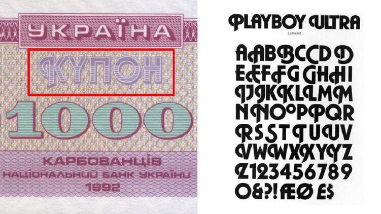 Надпись "купон" на купонокарбованцах 90-х годов, которые заменили собой советские рубли, сделан шрифтом Playboy 1975-го года (позже известный как Letraset Plaza, а сейчас просто Plaza). На это обратил внимание фрилансер Евгений Федорец и разработчик шрифтов Богдан Гдаль.