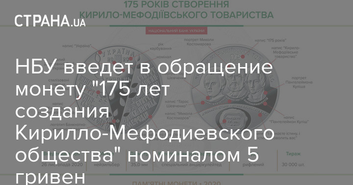 Национальный банк Украины с 26 ноября введет в обращение новую памятную монету "175 лет создания Кирилло-Мефодиевского общества" номиналом 5 гривен.