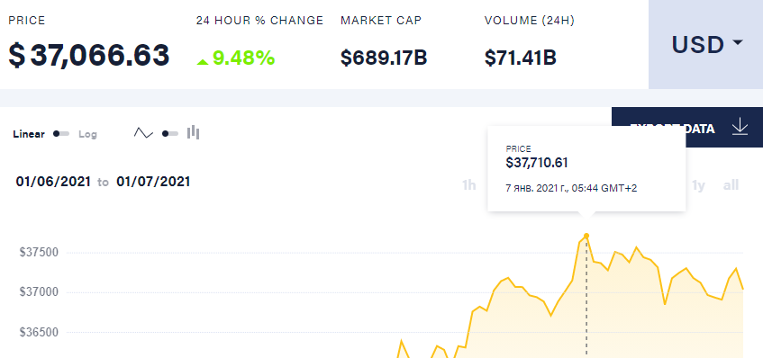 По состоянию на 5:44 (по киевскому времени) биткоин достиг отметки в 37 710 долларов.