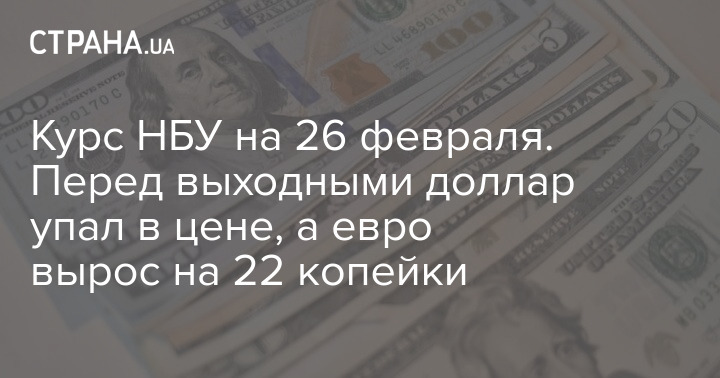 Национальный банк Украины установил в пятницу, 26 февраля, официальный курс гривны по отношению к иностранным валютам. По сравнению с предыдущим рабочим днем доллар немного подешевел, а евро значительно вырос в цене.