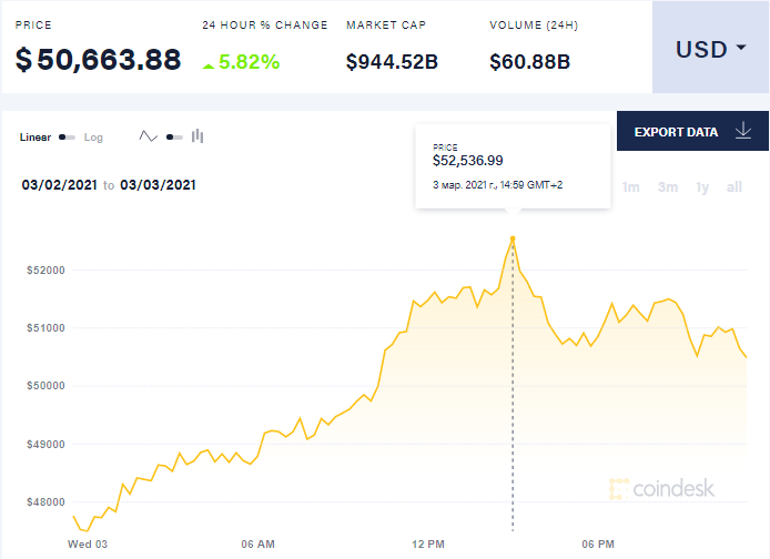 По состоянию на 23:30 (по киевскому времени), в среду, 3 марта, биткоин достиг отметки в 50 701 долларов. Однако по данным на 14:59 криптовалюта торговалась на отметке в 52 536 долларов. Таким образом, криптовалюта подскочила в цене более чем на 10%.