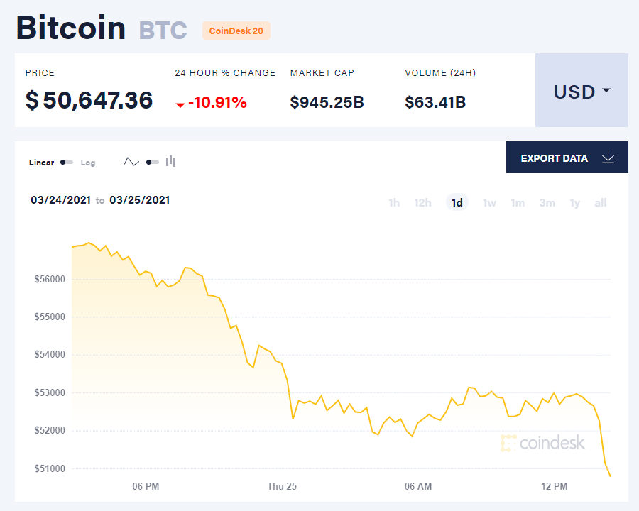 Учитывая, что вечером 24 марта цена биткоина достигала 56,9 тысяч, падение составило более 10%