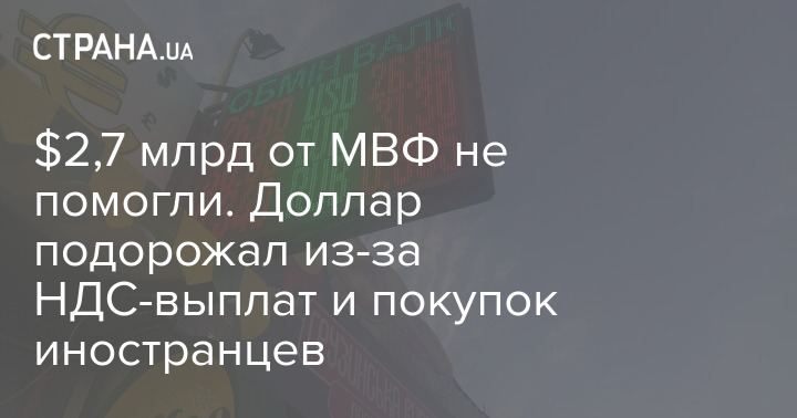 "На межбанк влияли две новости. Это фактическое поступление средств от МВФ, а также выплаты возмещений по НДС в конце месяца", - подтвердил "Стране" руководитель отдела аналитики ГК Forex Club Андрей Шевчишин.