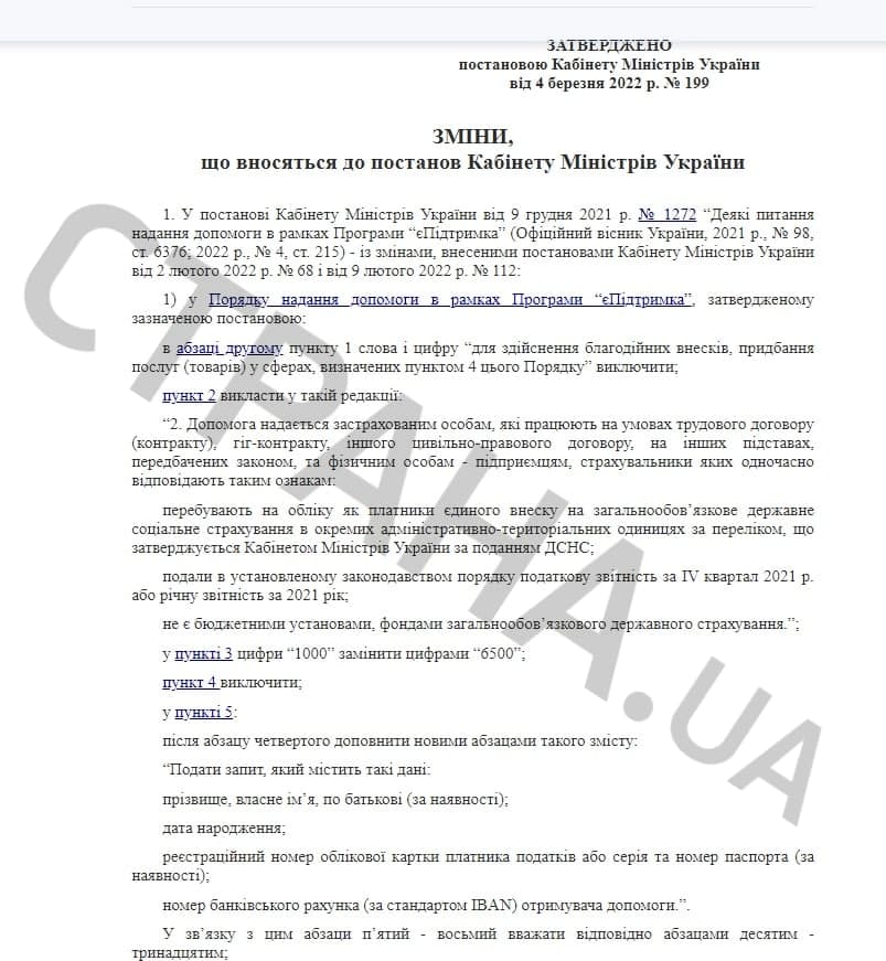 Это следует из постановления КМУ №199 от 4 марта 2022 года, которым вносятся изменения в более раннее правительственное постановление №1272 от 9 декабря 2021 года, касающееся программы "єПідтримка".
