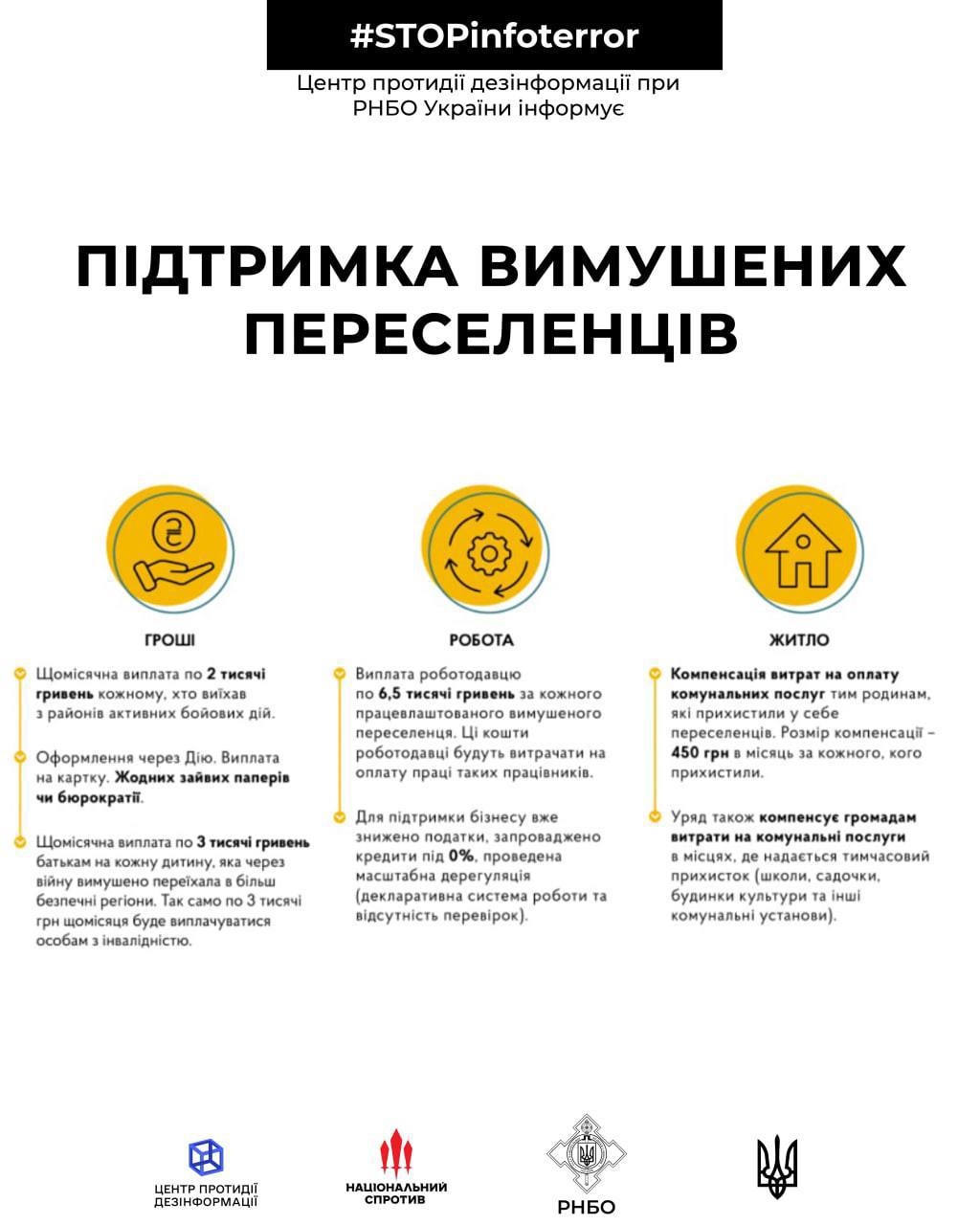 Центр противодействия дезинформации при СНБО Украины разъясняет, по каким направлениям, согласно решению правительства, вынужденные переселенцы могут получить государственную помощь.