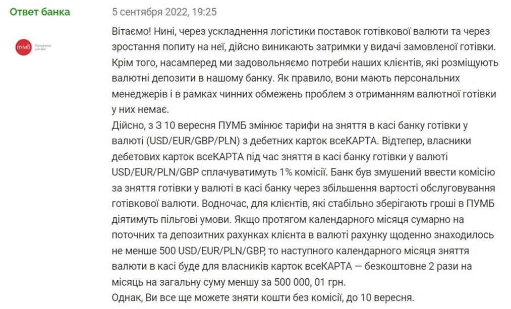 "Из-за военной агрессии России против Украины значительно усложнилась логистика поставок наличной валюты. В то же время резко возрос спрос на наличную валюту. И это повлекло за собой необходимость предварительного заказа клиентами валюты. Также напоминаем, что Вы можете рассчитаться картой к счету в иностранной валюте в торговой сети, получить валюту в АТМ за границей или снять средства в гривневом эквиваленте в случае отсутствия иностранной валюты в кассе отделения", — говорят в ПУМБе.