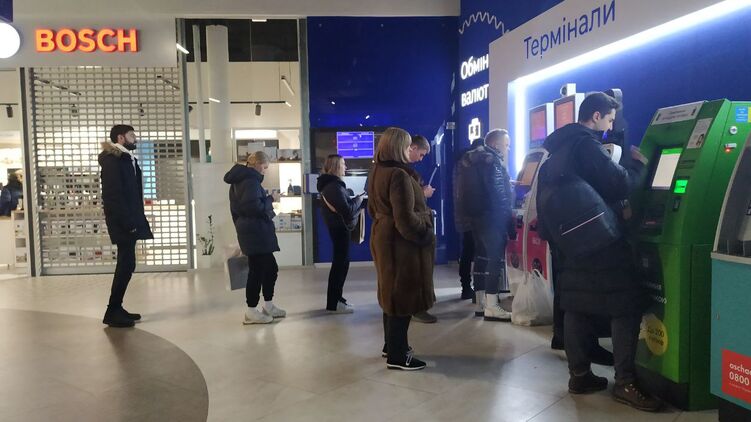 Один банкомат не работает по техническим причинам (обычно пустой, без наличных), а ко второму очередь — привычная история для киевских ТРЦ и супермаркетов.