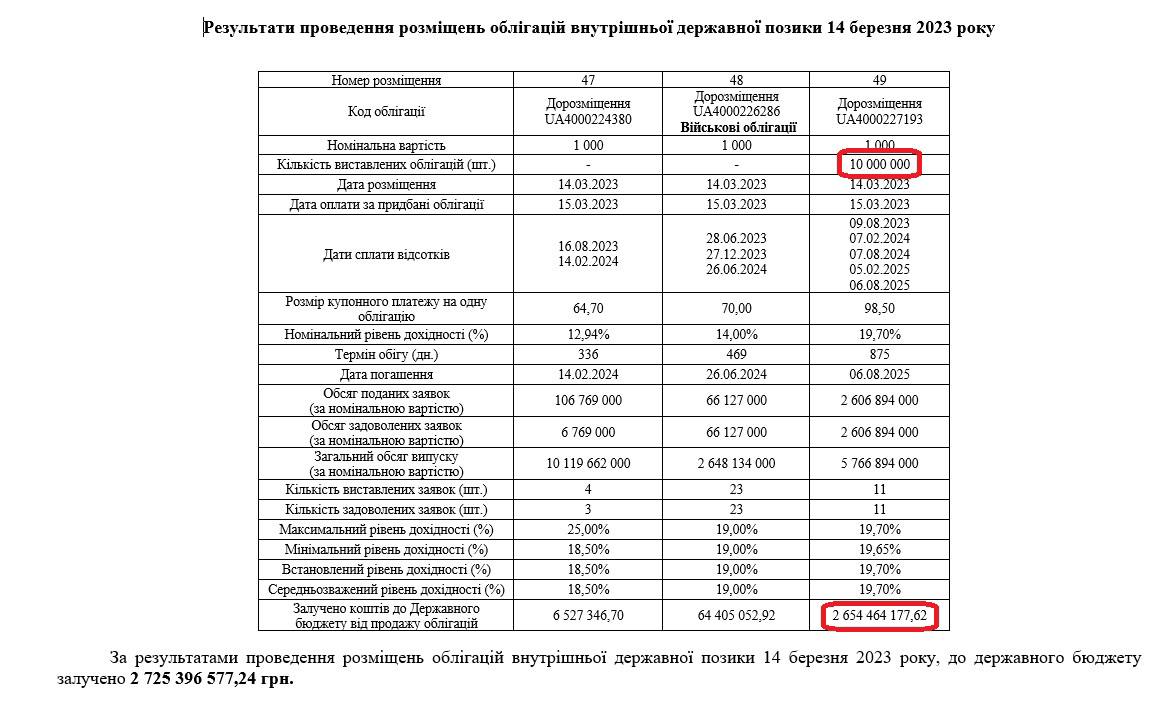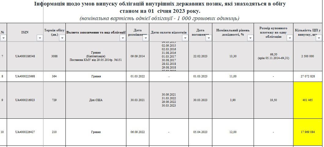 Что точно ясно - это что правительству внутренние заимствования постоянно нужны. Не только на текущие бюджетные расходы, но и на погашение старых выпусков гособлигаций. Например, через 2 недели, 30 марта, ему предстоит крупное погашение долларовых ОВГЗ - на $401,5 млн. А уже 4 апреля нужно будет выплатить почти 18 млрд грн по гривневым бумагам. За раз власти сейчас столько не собирают. При этом, как известно, Минфину не может больше помогать с финансированием Нацбанк, который в меморандуме с МВФ обязался свернуть эмиссию гривны в 2023 году и больше не выкупать гособлигации Кабмина (в 2022 году приобрел их на 400 млрд грн).