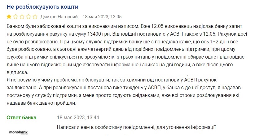 О похожих инцидентах заявляют также клиенты monobank. Там также говорят о нежелании банка оперативно разблокировать счет при наличии документа под это. Хотя в Украине с 2019 года действует Автоматизированная система исполнительного производства, АСИП (АСВП - укр.), которая позволяет это делать за считанные часы или даже минуты.