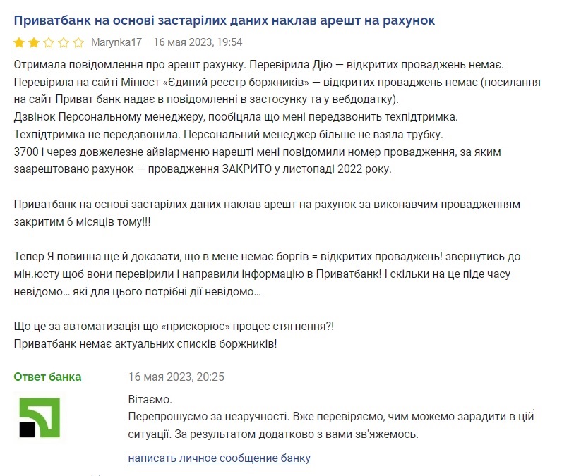 "Приватбанк на основании устаревших данных наложил арест на счета по исполнительному производству, закрытому 6 месяцев назад. Теперь я должна еще и доказать, что у меня нет долгов = открытых производств", - говорится в жалобе клиента Приватбанка Марины.
