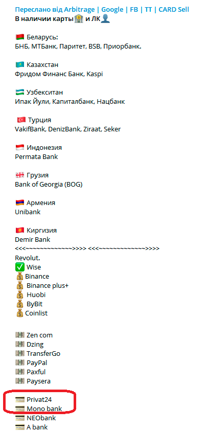 Причем перепродают карты не только украинских банков, но и иностранных. Что говорит о договорных открытиях счетов не только в нашей стране, но и в других: Беларусь, Казахстан, Турция, Индонезия, Грузия, Армения, Киргизия.