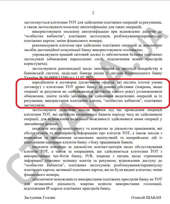 В нем говорится о том, что регулятор получил от государственных органов информацию о незаконных платежных операциях, проходящих "на временно оккупированных территориях (далее - ВОТ) с использованием удвоенных систем коммуникаций украинских банков".