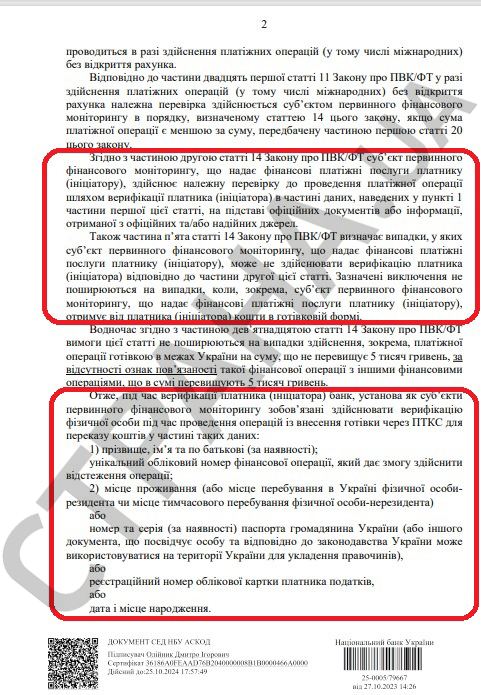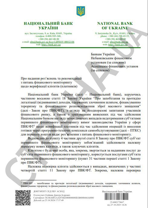 В письме №25-0005/79667 НБУ потребовал, чтобы не только банки, но и небанковские владельцы терминалов проводили финансовый мониторинг своих плательщиков при внесении наличных.