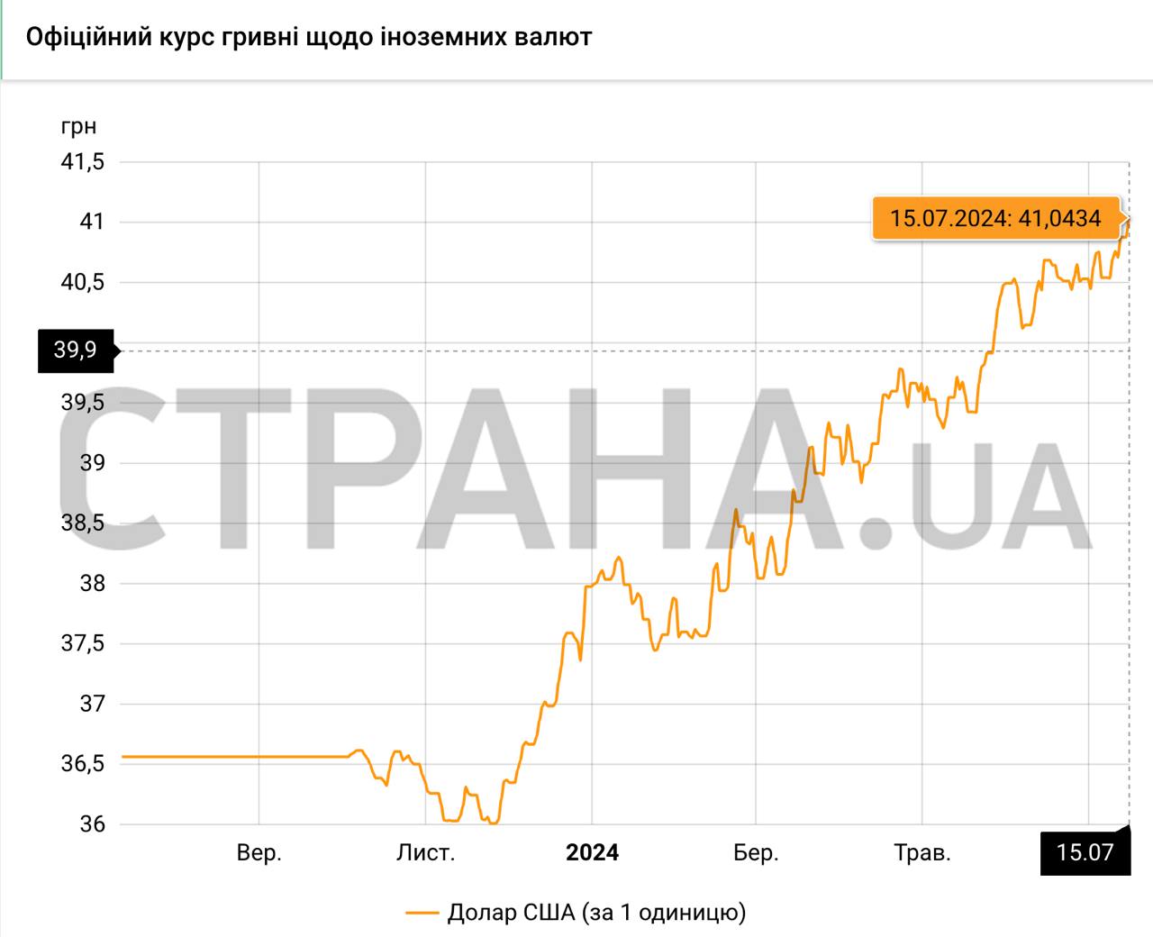 Национальный банк Украины впервые установил официальный курс доллара выше 41 гривни. На понедельник, 15 июля, он составит 41,0434.