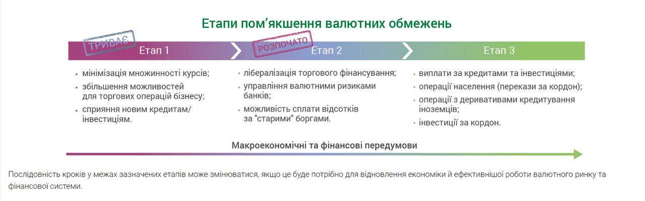 На официальном сайте НБУ опубликованы приблизительные этапы снятия валютных смягчений, без привязки к конкретным временным промежуткам. Там валютные послабления для населения отнесены к третьему этапу, а регулятор пока находится на втором.