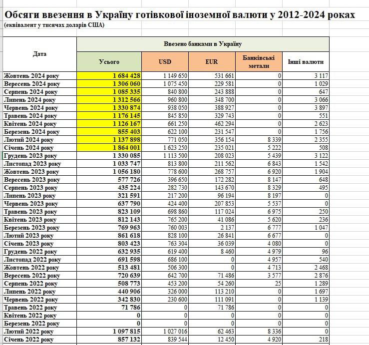 Финансисты продолжают говорить о стабильном спросе на инвалюту со стороны населения. Сегодня ее подтвердил свежий отчет Нацбанка по объемам завоза банками в свои кассы наличного доллара: зафиксирован рост на 29% в октябре (до $1,68 млрд), а также на 81,4% (до $12,9 млрд) за 9 месяцев 2024 года в сравнении с аналогичным периодом 2023-го ($7,1 млрд) и сразу в 4,1 раза больше с довоенного 2021-го ($3,2 млрд).