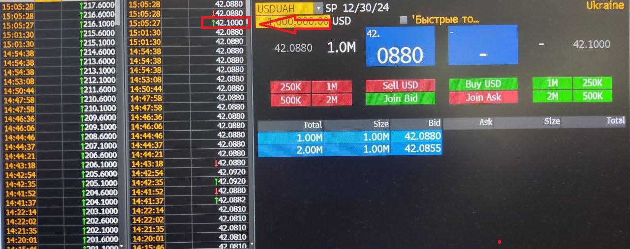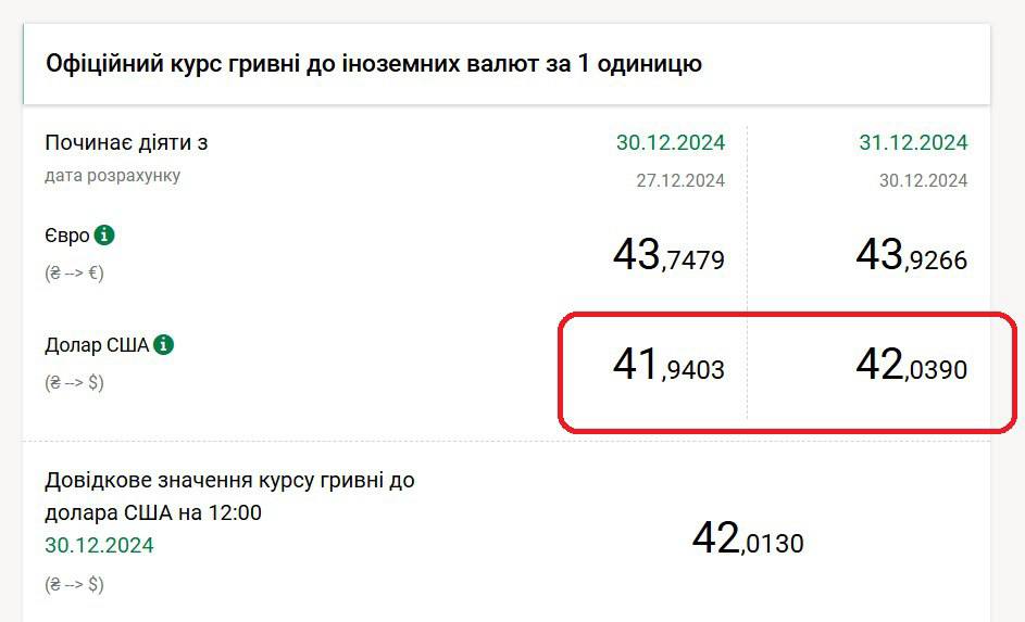 По итогам дня Национальный банк поднял свой официальный курс в паре гривна/доллар с 41,9403 грн/$ до 42,0390 грн/$. Он установлен на 31 декабря, последний день 2024 года. Это новый исторический максимум. До этого нацбанковский курс еще ни разу не пересекал отметку в 42 гривны, а предыдущим максимум составлял 41,99 грн/$ (24 декабря).