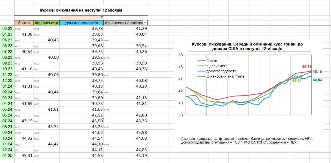 Опрос касался курсовых ожиданий в паре гривна и доллар на ближайшие 12 месяцев. Данные были собраны в трех группах, представителей которых проинтервьюировали в январе 2025 года: банки, эксперты финансового рынка и домохозяйства.
