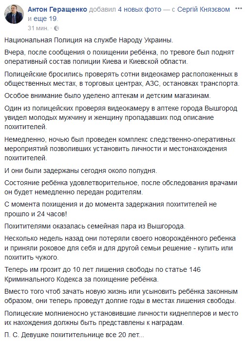У похитителей ребенка на Оболони в Киеве недавно умер собственный. Именно это стало причиной, по которая пара решилась на похищение. Об этом сообщает советник министра МВД Антон Геращенко на своей странице в Facebook.