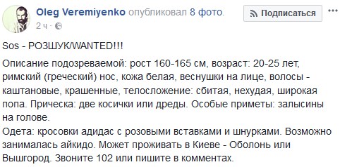 "Описание подозреваемой: рост 160-165 см, возраст: 20-25 лет, римский (греческий) нос, кожа белая, веснушки на лице, волосы - каштановые, крашенные, телосложение: сбитая, нехудая, широкая попа. Прическа: две косички или дреды. Особые приметы: залысины на голове.