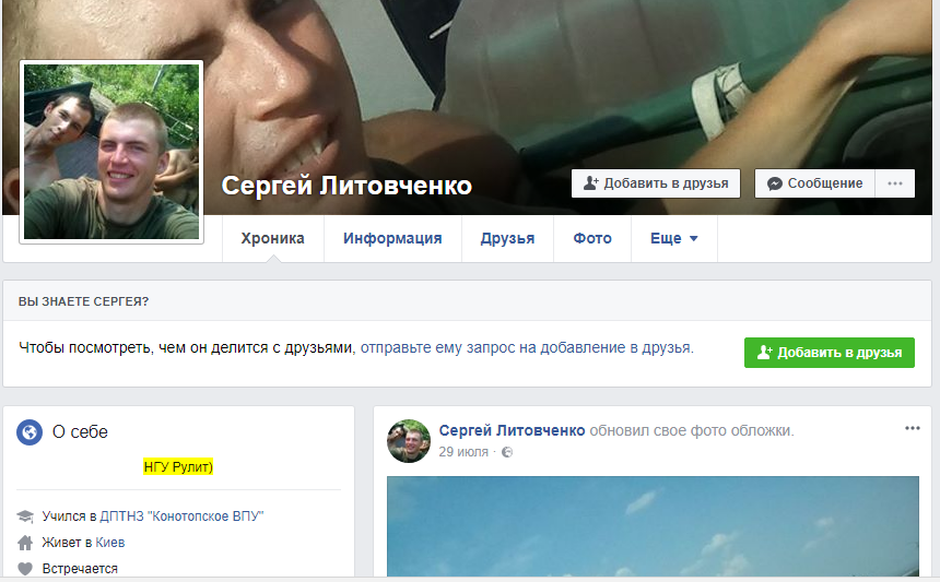 На странице в Facebook у него много фотографий в военной форме и подпись: "НГУ рулит". Вероятно, 21-летний парень служил в Нацгвардии.