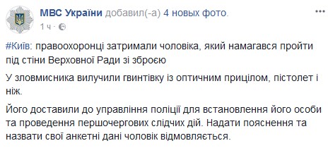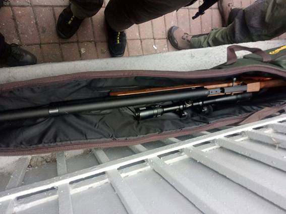Начальник главного управления Национальной полиции Украины в г.Киеве Андрей Крищенко в эфире телеканала "112.Украина" сообщил, что пистолет, обнаруженный у мужчины, - для отстрела резиновых пуль, при нем были соответствующие патроны, а винтовку правоохранители еще проверяют.